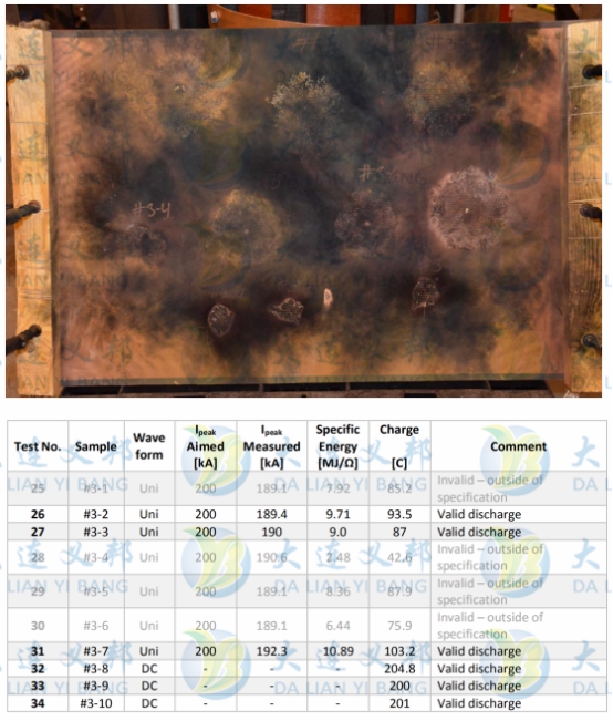 本次測試標準IEC61400-24,能量10MJ,電流20萬安培,測試制板完全模擬國內風電主流使用的鋪貼工藝和層間結構。令人欣喜的是,進行實驗的317gsm鋁網和420gsm銅網在經歷三次短波、三次長波沖擊后,都有效的保護了層間結構,并在傳導區域沒有出現任何熔斷或斷裂,達到了一級防雷的效果。實驗報告結果附下。