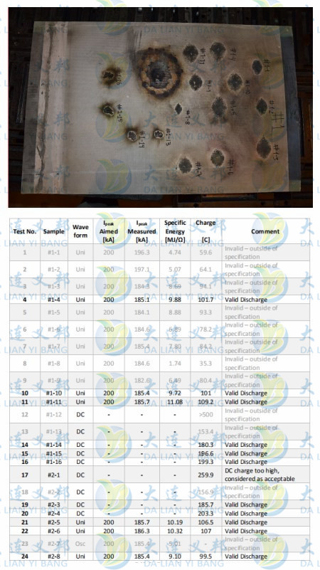 針對國內風電發展現狀,為真實的模擬實際應用環境,考慮到風電葉片層間結構與飛機復合材料不同,大連義邦率先在國際風電業界最權威的雷擊測試單位,丹麥Global Lightning Protection Service A/S ( 簡稱GLPS ,PolyTech旗下)進行大電流雷擊模擬實驗,GLPS結合250年的風力防雷擊系統設計、測試經驗,125種以上葉片與葉尖在實驗室的測試,70次以上的防雷系統仿真,已是國際風電業耳熟能詳的最具權威的雷擊測試機構。