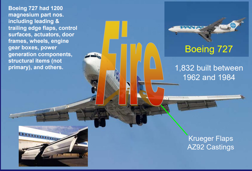波音727有1200個鎂零件。包括前緣和后緣襟翼,控制面,執(zhí)行器,門框,車輪,發(fā)動機齒輪箱,發(fā)電部件,以及非主要結構等。